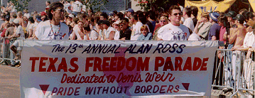 Thousands gathered on Sunday, September 29, 1996 to celebrate the 13th annual Alan Ross Texas [gay] Freedom Parade. This year's theme was diversity, of which there was plenty. More than 100 religious and social-service groups, nightclubs, cheerleaders, musicians, drag queen troupes, sports clubs,and student organizations marched.