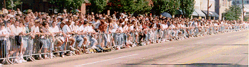 The parade ground stretched about a mile down Cedar Springs Road. Soon enthusiastic spectators, restrained by baracades lining each side of the street would cheer and raise their hands to grab the thousands of dollars of candy thrown from the floats.